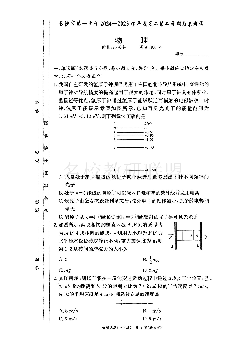 长沙市第一中学2024-2025学年度高二第二学期期末考试 物理试题(含答案).pdf