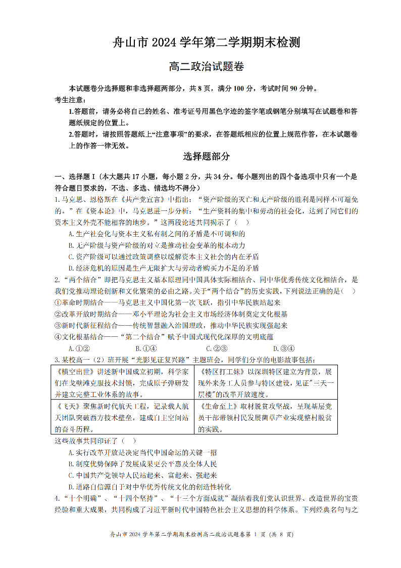 政治试题卷|2506舟山高二下期末统考.pdf