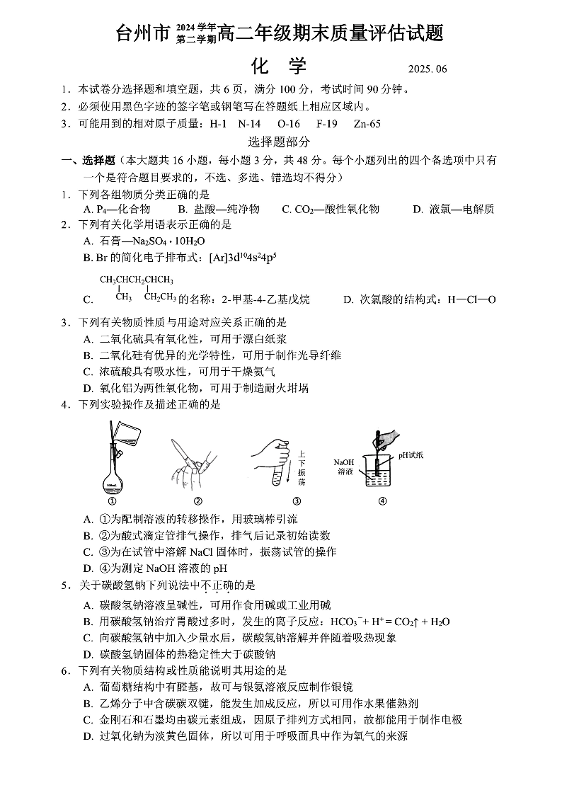 化学试题|2506台州高二期末.pdf