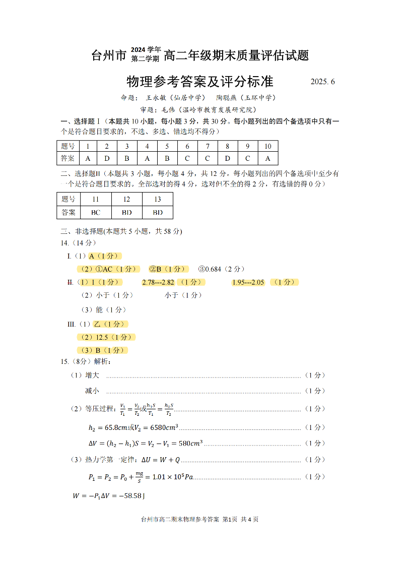 物理答案|2506台州高二期末.pdf