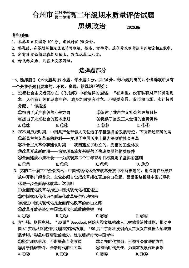 政治试题|2506台州高二期末.pdf