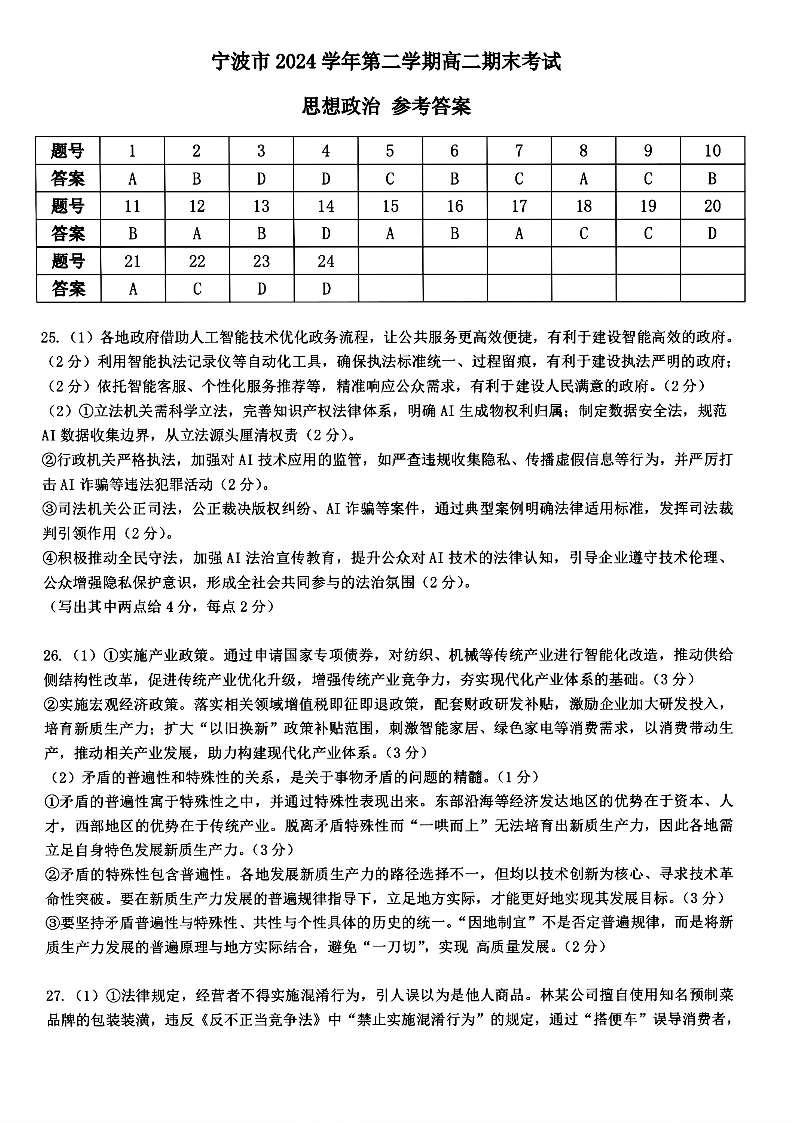 政治试题卷|2506宁波高二下期末考答案.pdf