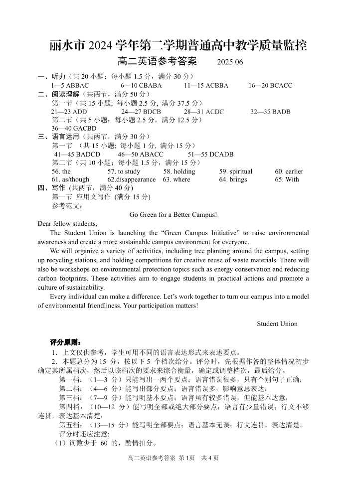 英语试题卷|2506丽水高二下期末统考答案.pdf