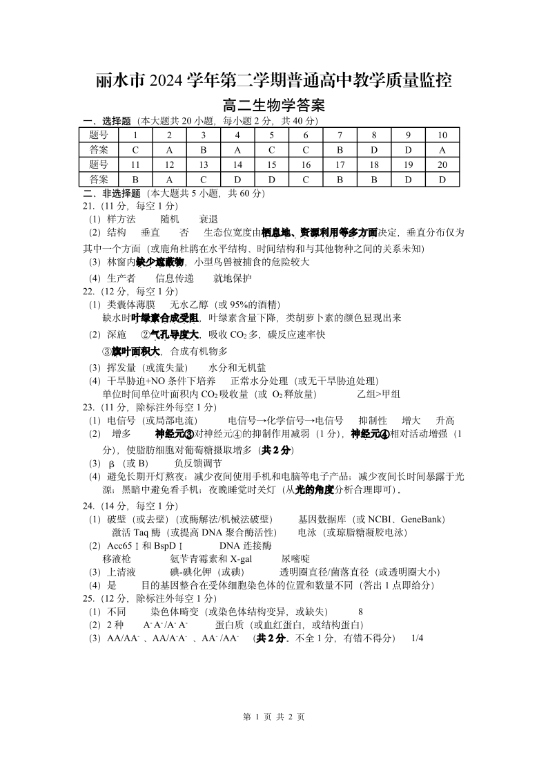 生物试题卷|2506丽水高二下期末统考答案.pdf