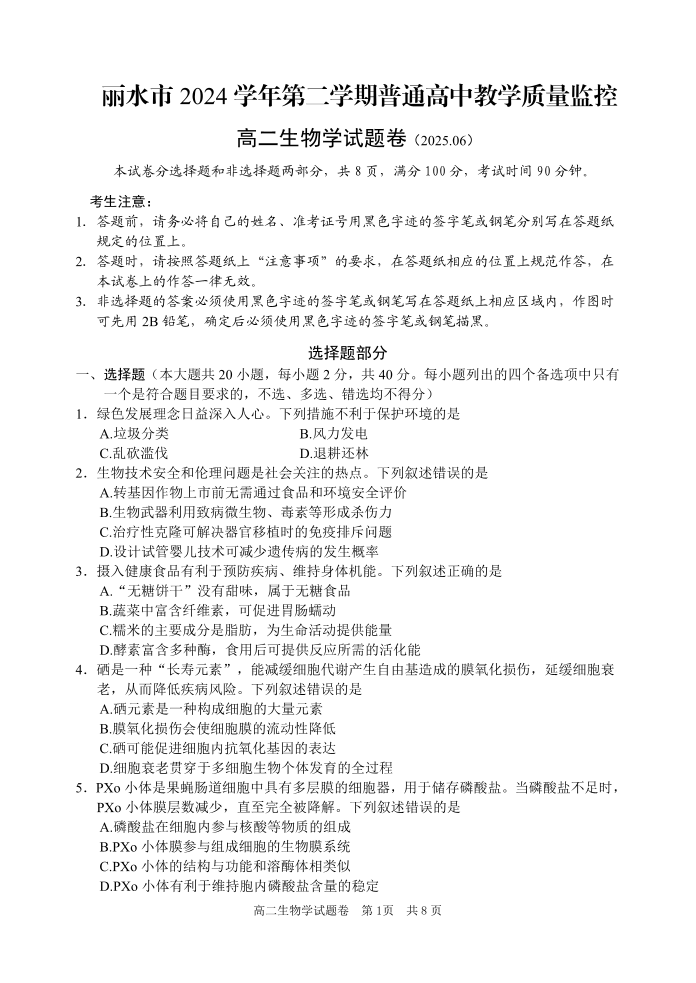 生物试题卷|2506丽水高二下期末统考.pdf
