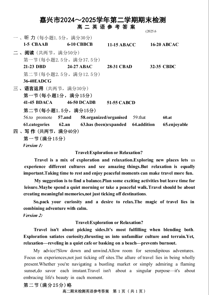 英语试题卷|2506嘉兴高二下期末统考答案.docx