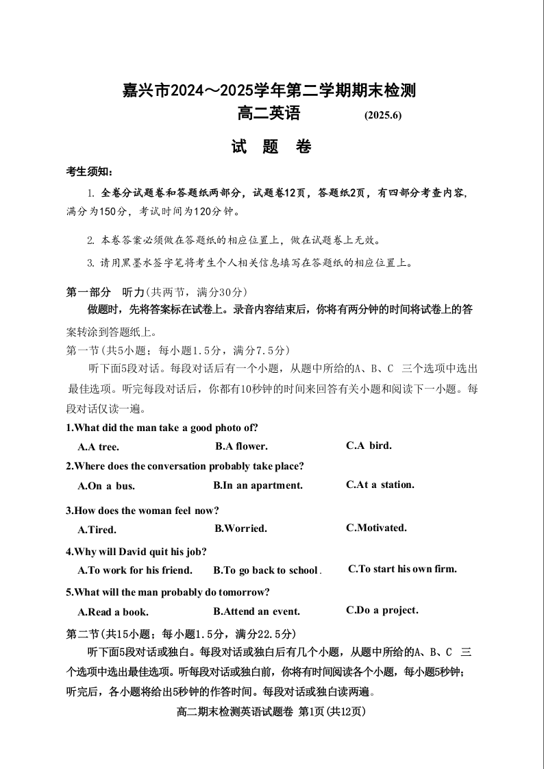 英语试题卷|2506嘉兴高二下期末统考.docx