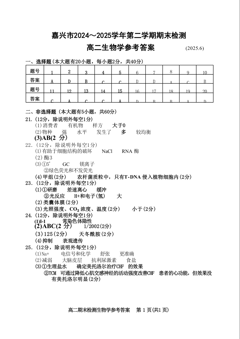 生物试题卷|2506嘉兴高二下期末统考答案.docx
