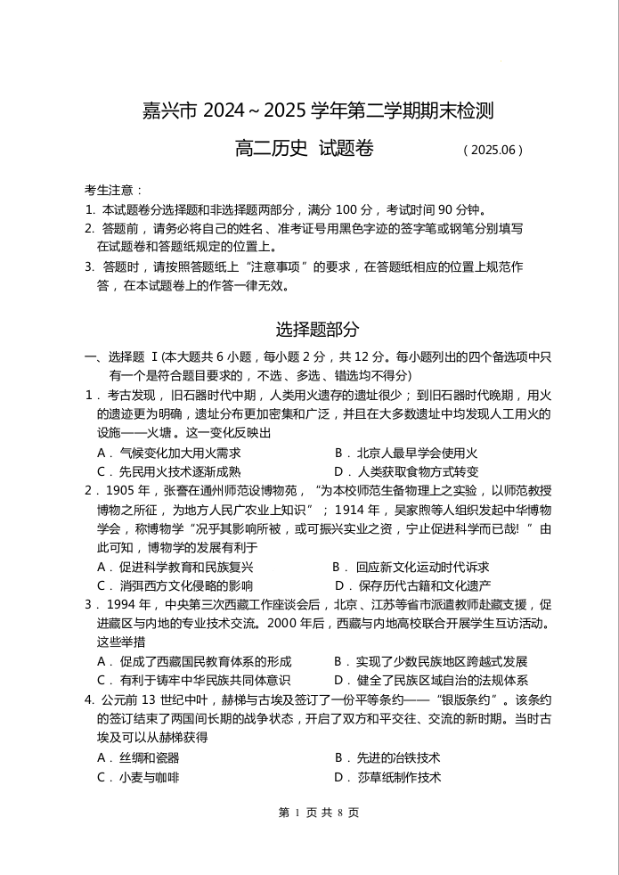历史试题卷|2506嘉兴高二下期末统考.docx