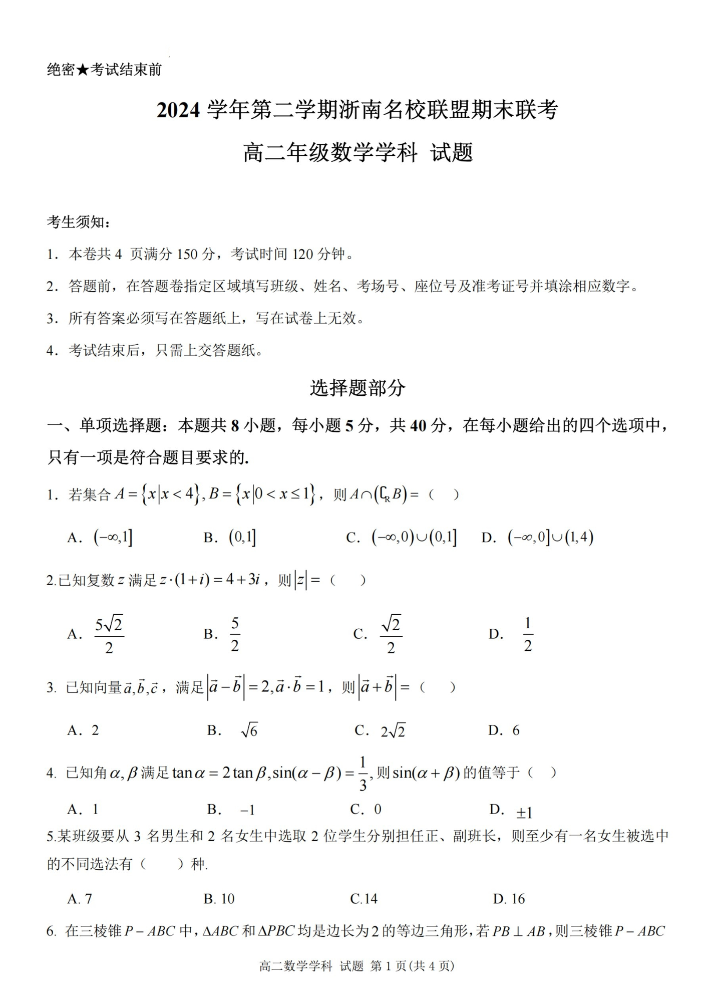 数学试题卷|2506浙南名校联盟高二下期末统考.pdf
