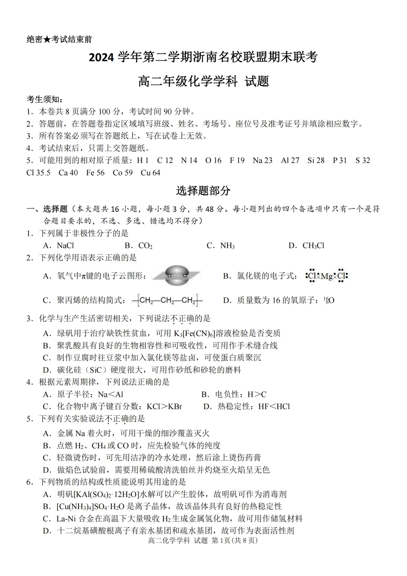 化学试题卷|2506浙南名校联盟高二下期末统考.pdf