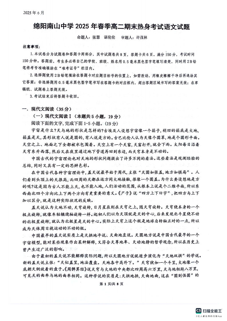 四川省绵阳南山中学2025年春季高二期末热身考试 语文试卷(含答案).pdf