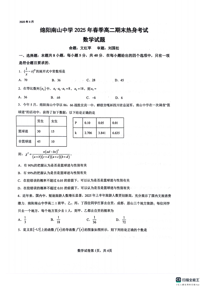 四川省绵阳南山中学2025年春季高二期末热身考试 数学试卷(含答案).pdf