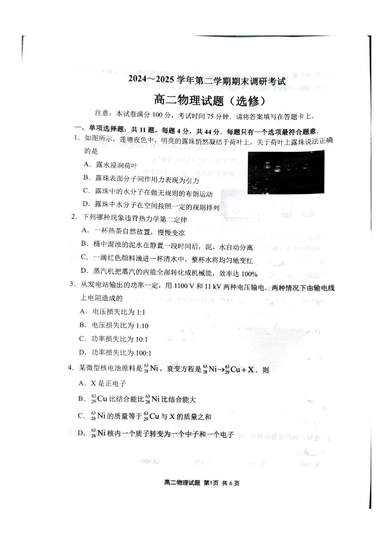 江苏省连云港市2024-2025学年第二学期高二期末调研考试 物理试卷(含答案).pdf