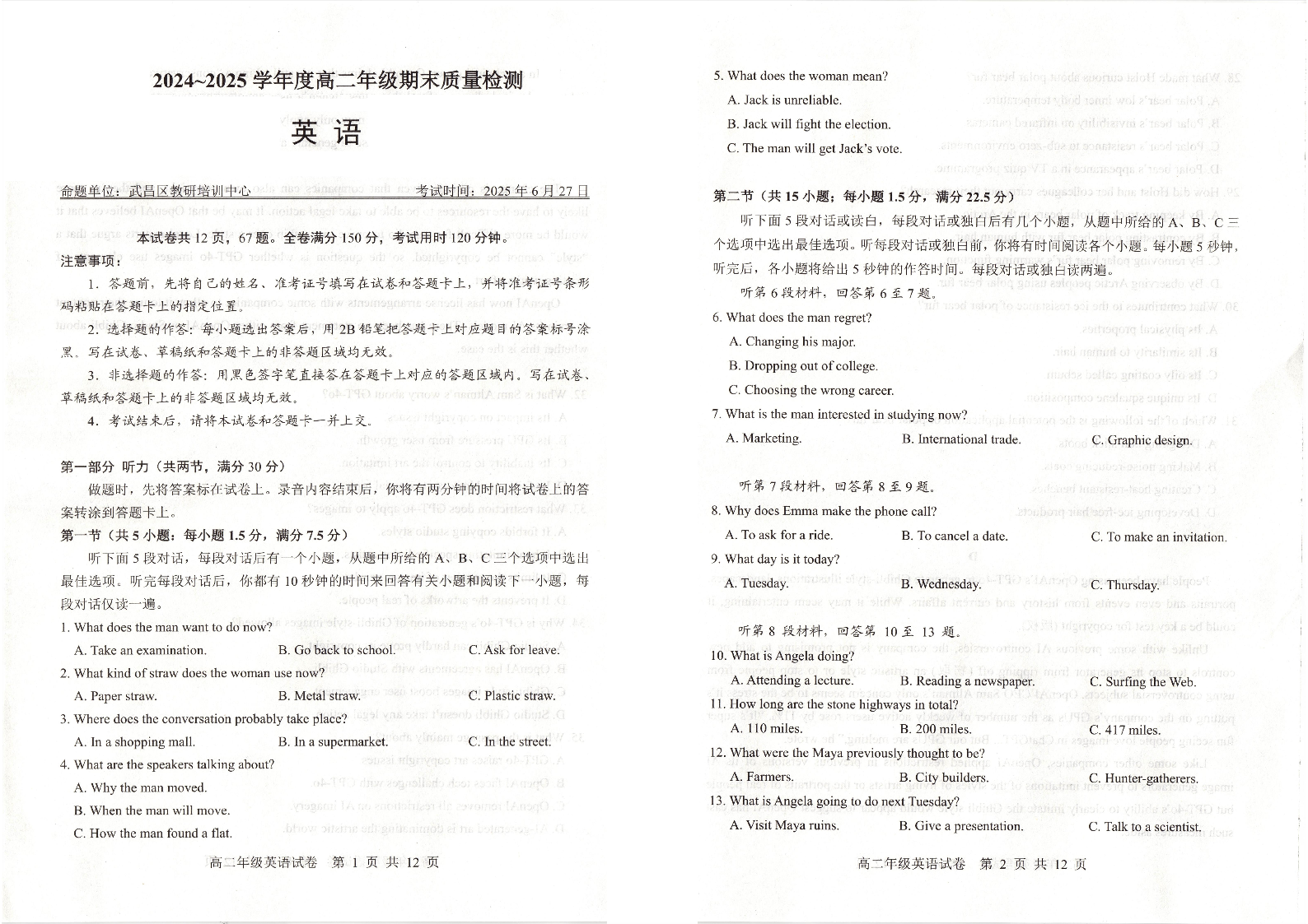 湖北省武昌区2024~2025学年度高二年级下学期期末质量检测 英语.pdf