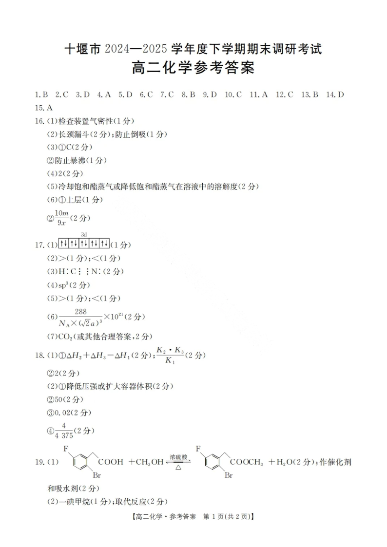 湖北省十堰市2024-2025学年度下学期高二年级期末调研考试 化学答案.pdf