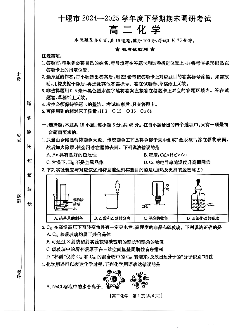 湖北省十堰市2024-2025学年度下学期高二年级期末调研考试 化学.pdf