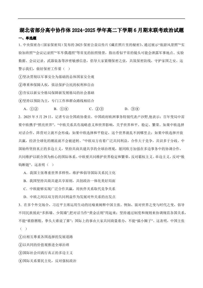 湖北省部分高中协作体2024-2025学年下学期高二年级期末联考 政治试卷(含答案).pdf
