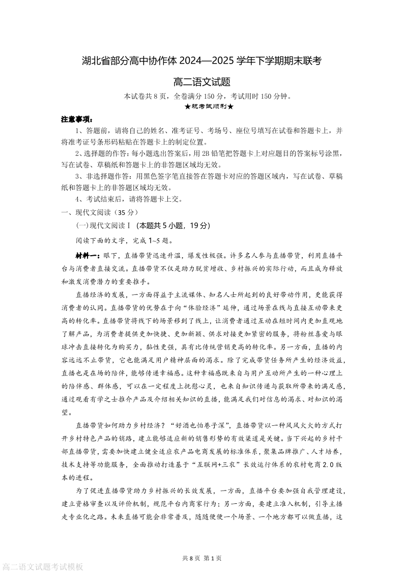 湖北省部分高中协作体2024-2025学年下学期高二年级期末联考 语文试卷(含答案).pdf