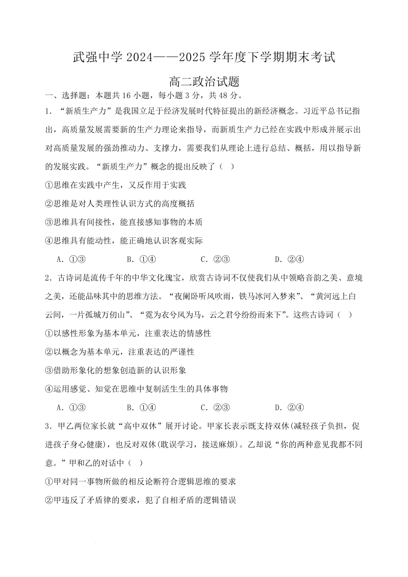 河北省衡水市武强中学2024-2025学年高二下学期期末考试 政治试卷(含答案).pdf