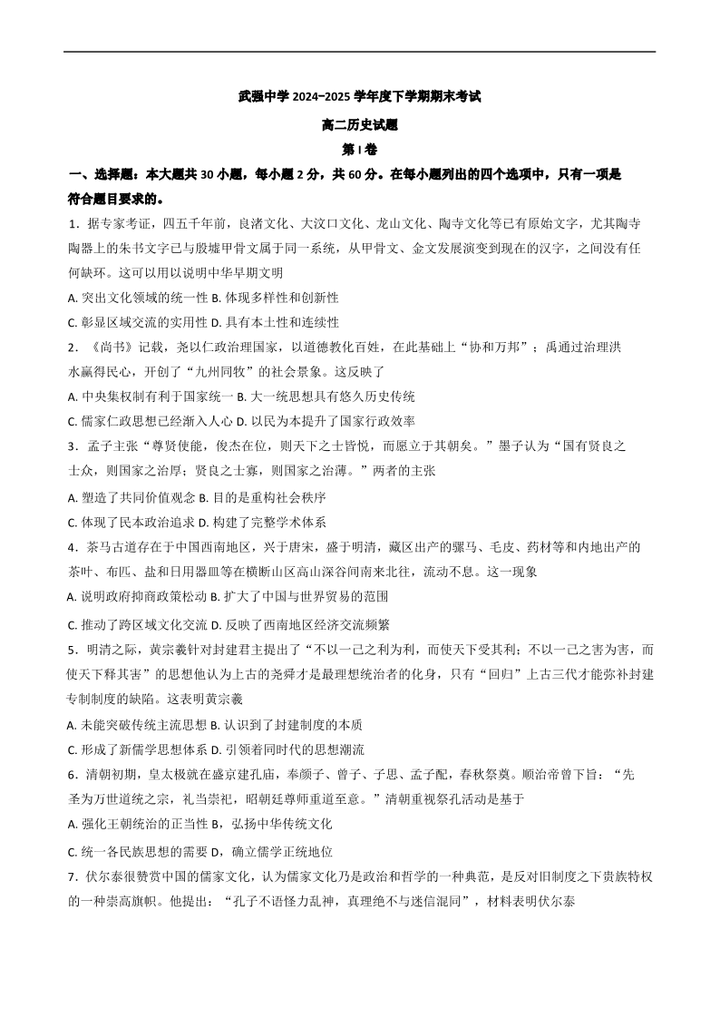 河北省衡水市武强中学2024-2025学年高二下学期期末考试 历史试卷(含答案).pdf
