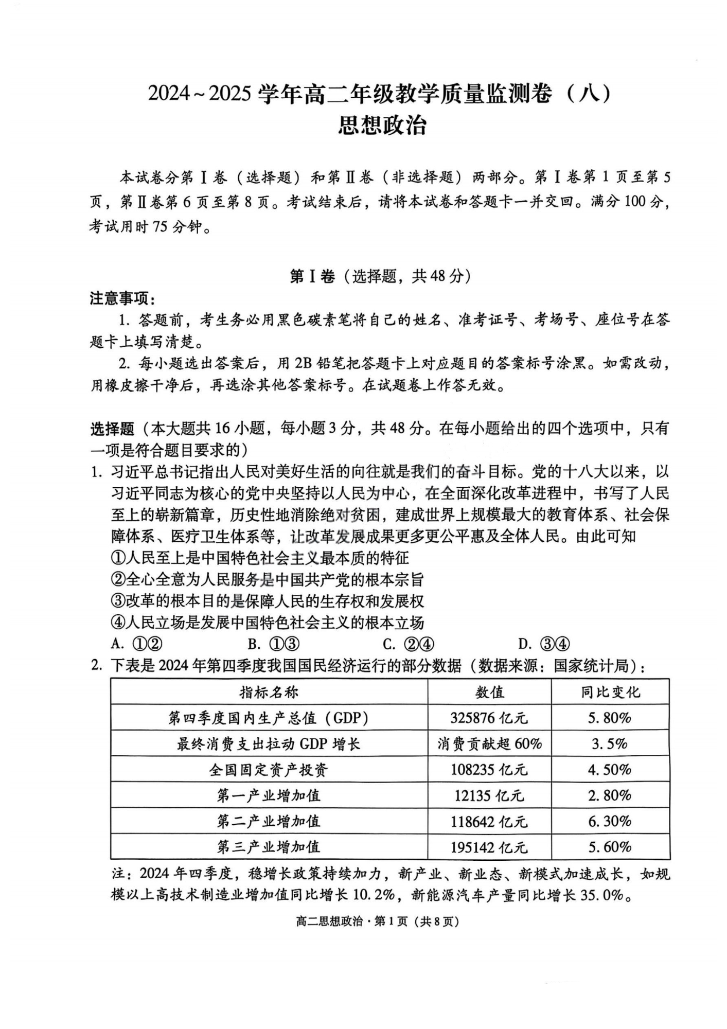 云南师大附中2024-2025学年高二年级教学质量监测卷(八)政治.pdf