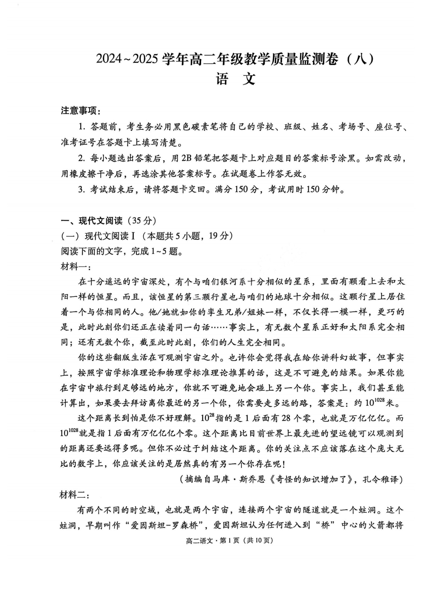 云南师大附中2024-2025学年高二年级教学质量监测卷(八)语文.pdf