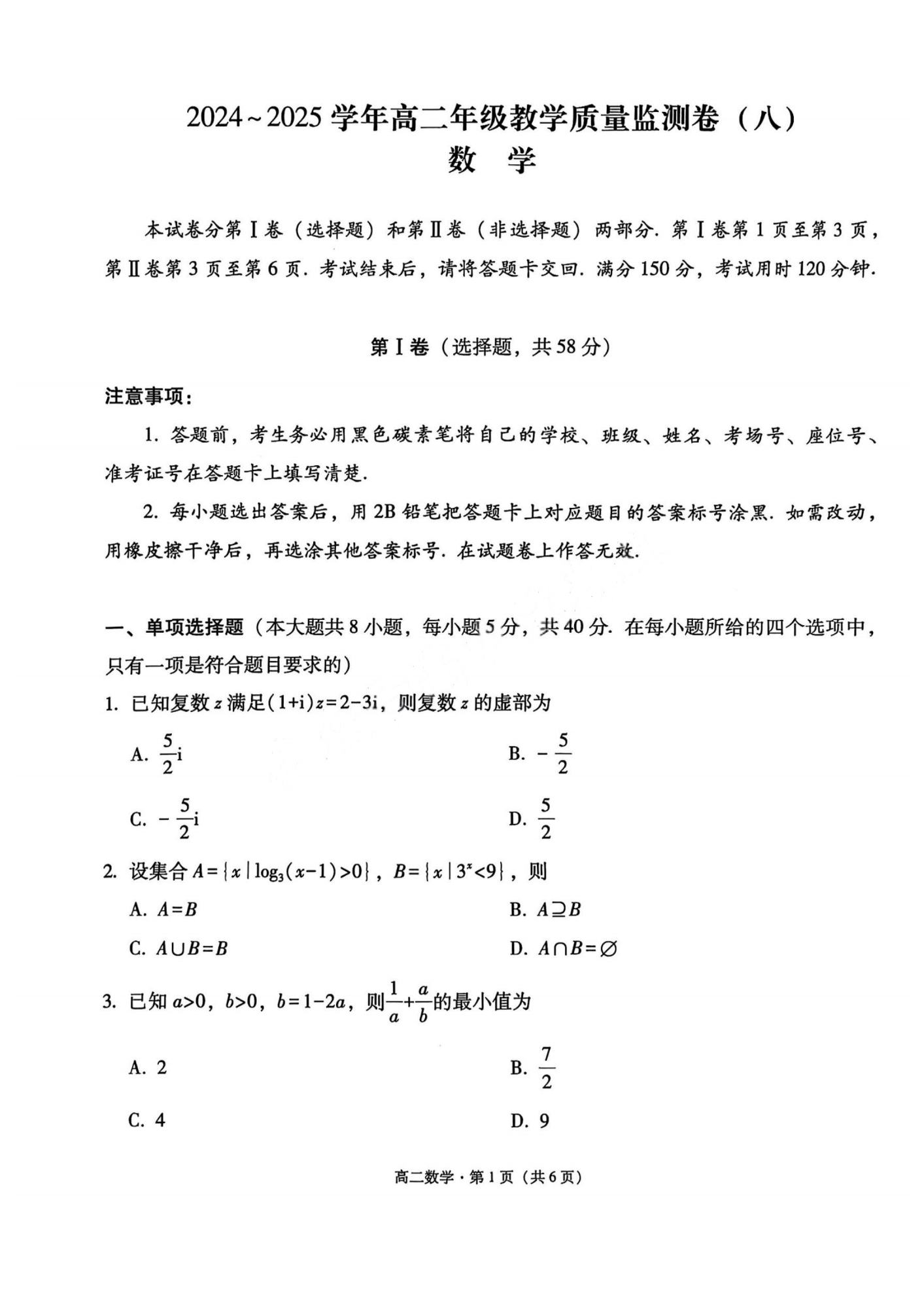 云南师大附中2024-2025学年高二年级教学质量监测卷(八)数学.pdf