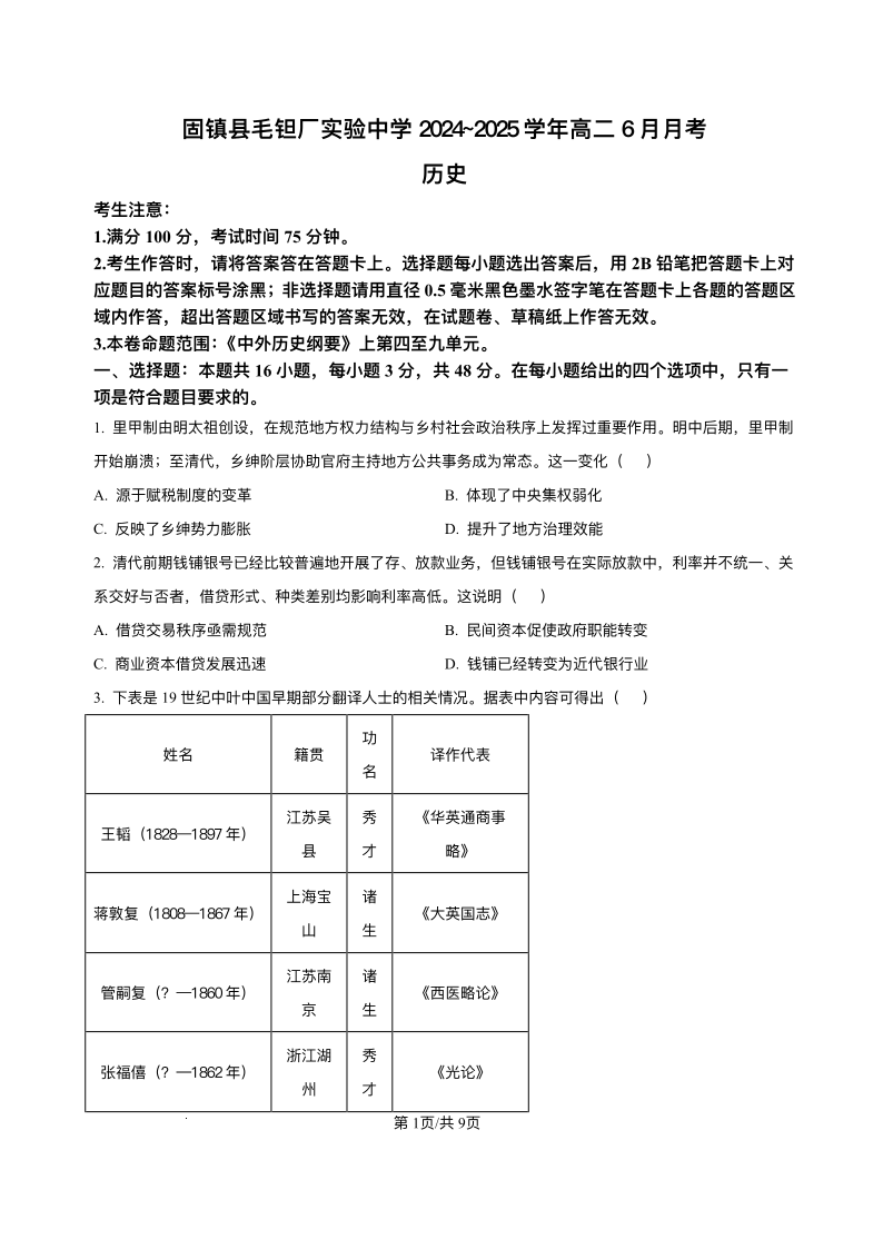 安徽省毛钽厂实验中学2024-2025学年高二下学期6月月考 历史试卷(含答案).pdf