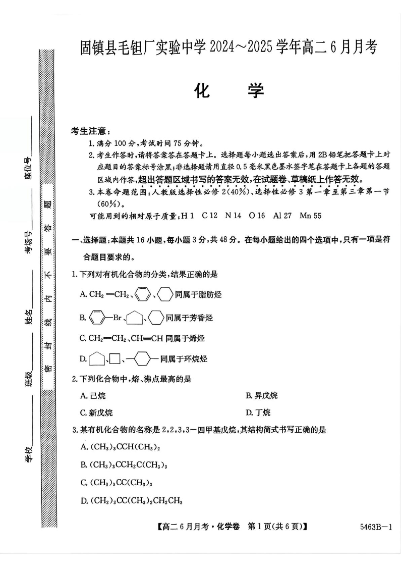 安徽省毛钽厂实验中学2024-2025学年高二下学期6月月考 化学试卷(含答案).pdf