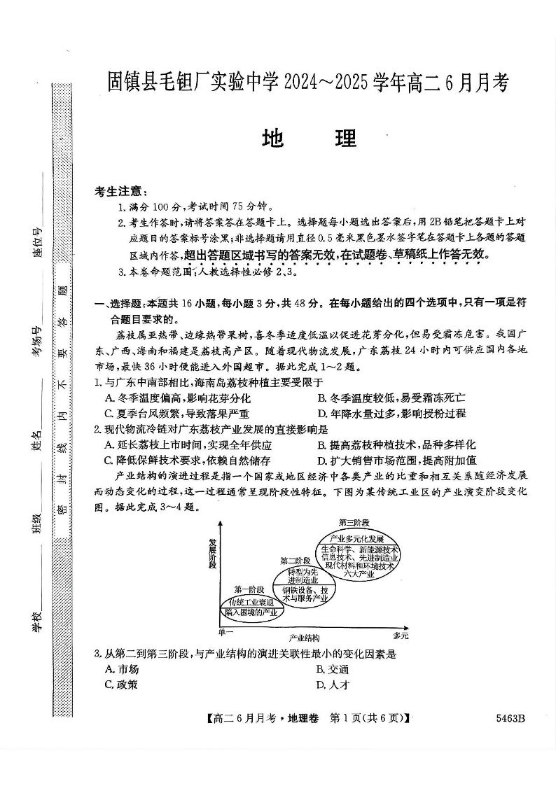 安徽省毛钽厂实验中学2024-2025学年高二下学期6月月考 地理试卷(含答案).pdf
