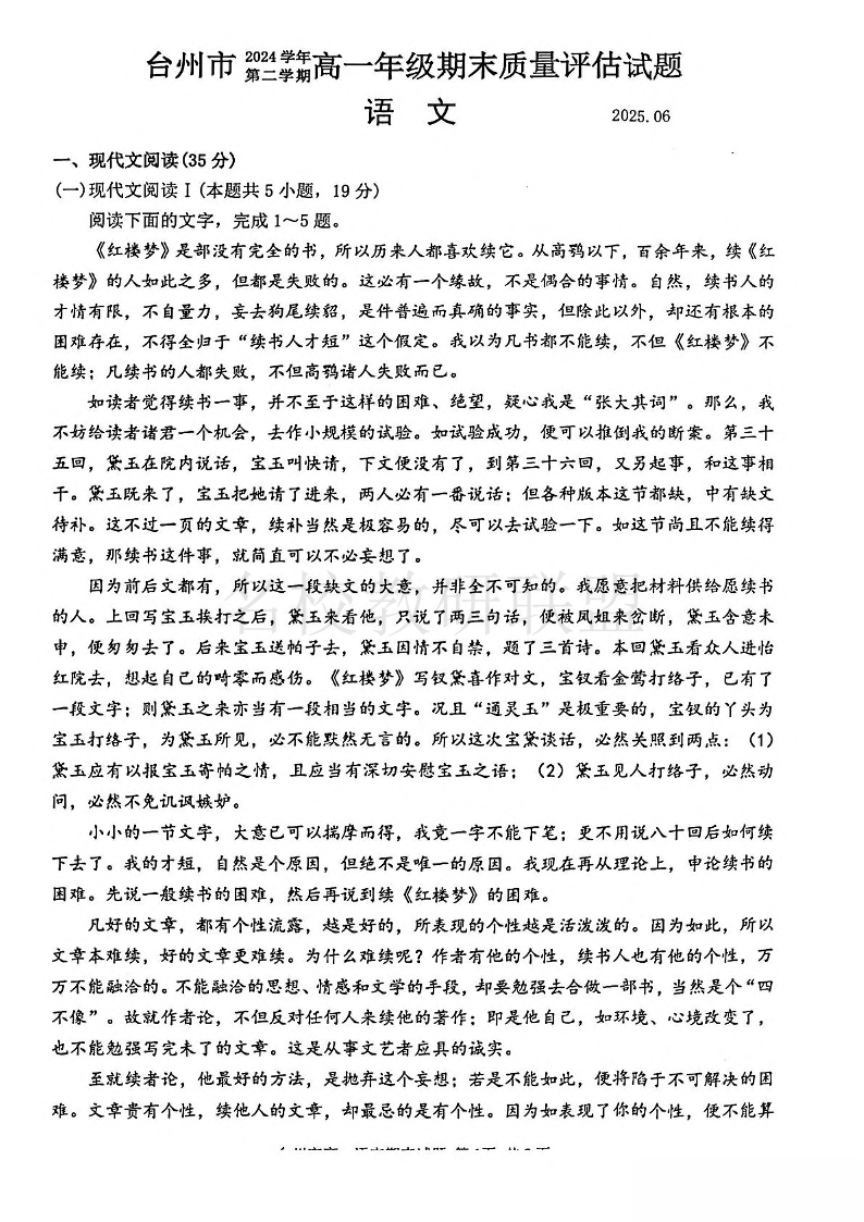 台州市2024学年第二学期高一年级期末质量评估 语文试卷(含答案).pdf