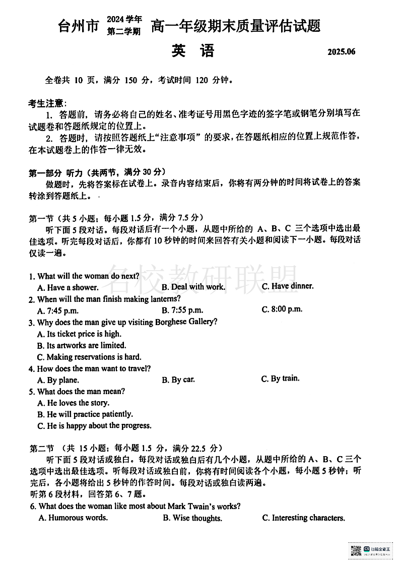 台州市2024学年第二学期高一年级期末质量评估 英语试卷(含答案).pdf