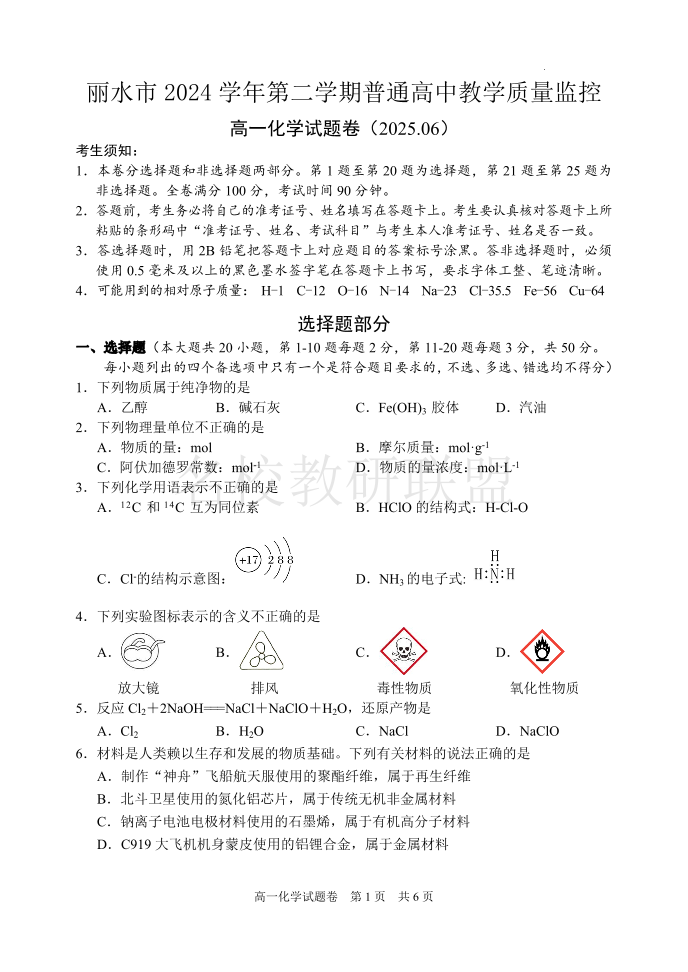化学试题|2506丽水高一期末.pdf