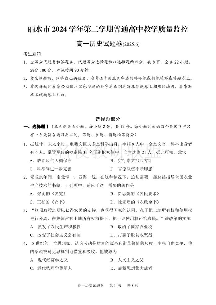 历史试题|2506丽水高一期末.pdf