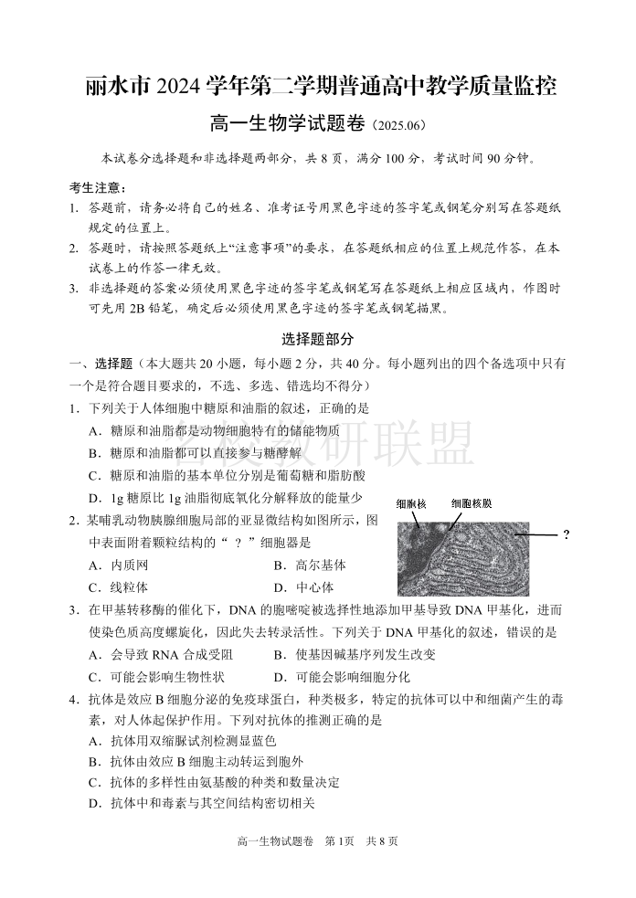 生物试题|2506丽水高一期末.pdf