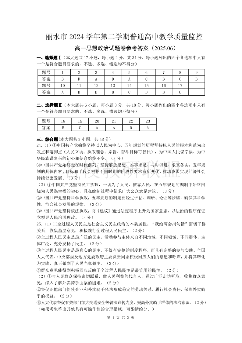 政治答案|2506丽水高一期末.pdf