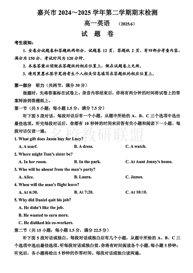 嘉兴市2024-2025学年高一年级第二学期期末测试 英语试卷(含答案).pdf