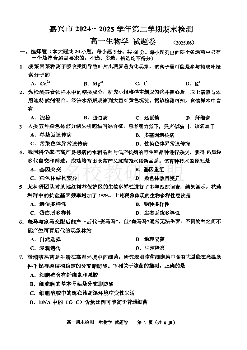 嘉兴市2024-2025学年高一年级第二学期期末测试 生物试卷(含答案).pdf