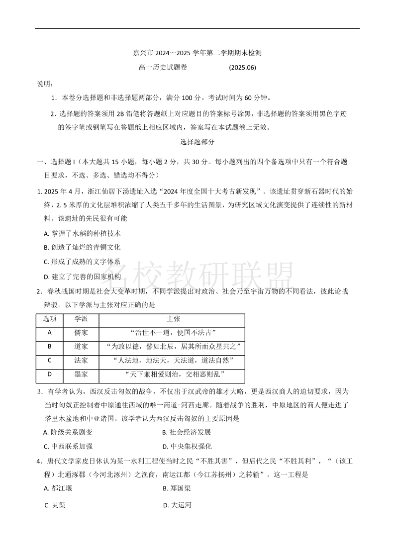 嘉兴市2024-2025学年高一年级第二学期期末测试 历史试卷(含答案).pdf