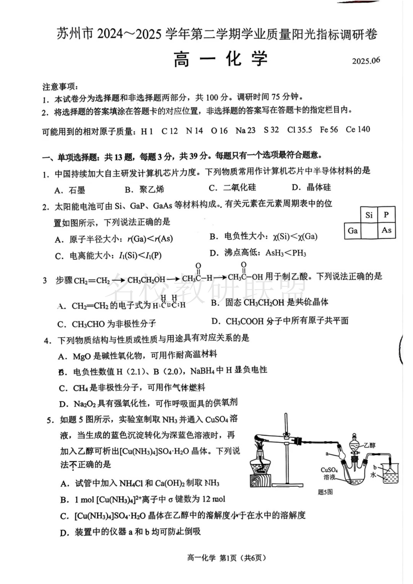 江苏省苏州市2024-2025学年高一下学期学业质量阳光指标调研 化学试卷(含答案).pdf