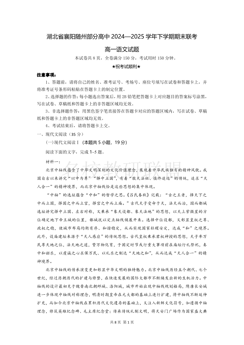 湖北省襄阳随州部分高中2024-2025学年高一下学期期末联考 语文.pdf