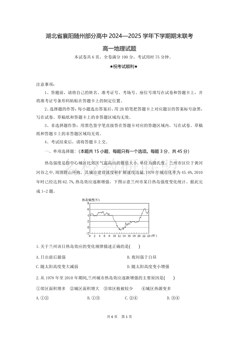 湖北省襄阳随州部分高中2024-2025学年高一下学期期末联考 地理.pdf