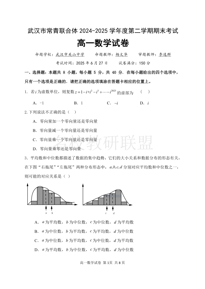 武汉市常青联合体2024-2025学年度高一下学期期末考试 数学.pdf