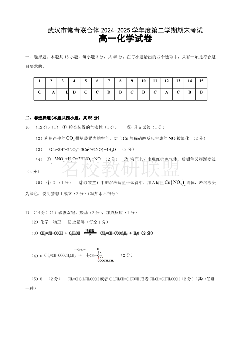 武汉市常青联合体2024-2025学年度高一下学期期末考试 化学答案.pdf