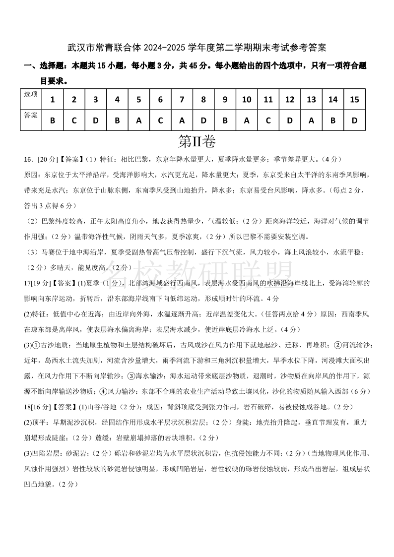 武汉市常青联合体2024-2025学年度高一下学期期末考试 地理答案.pdf
