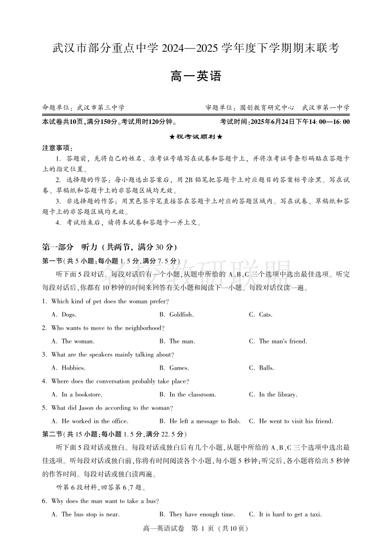 湖北省武汉市部分重点中学2024-2025学年度高一下学期期末联考 英语.pdf