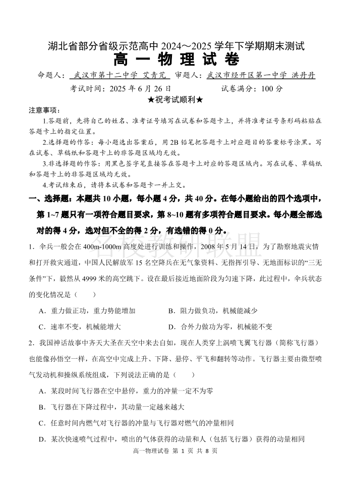 湖北省武汉市部分重点中学2024-2025学年度高一下学期期末联考 物理.pdf