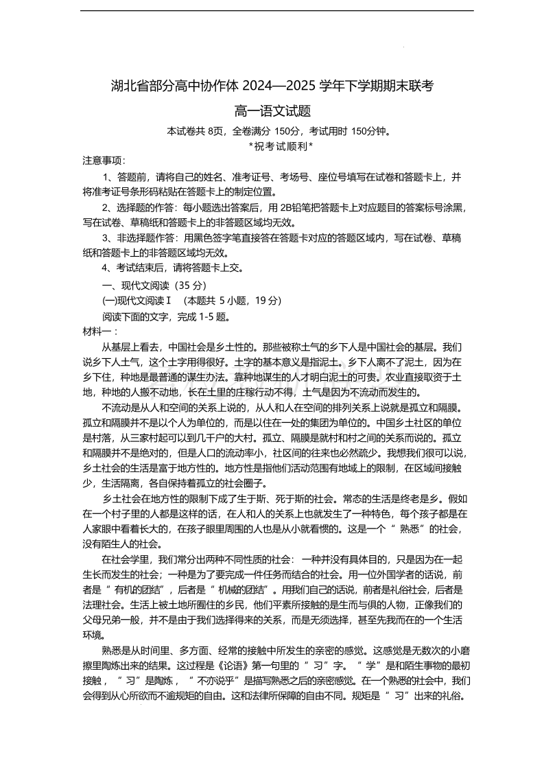 湖北省部分高中协作体2024-2025学年高一下学期期末联考 语文试卷(含答案).pdf