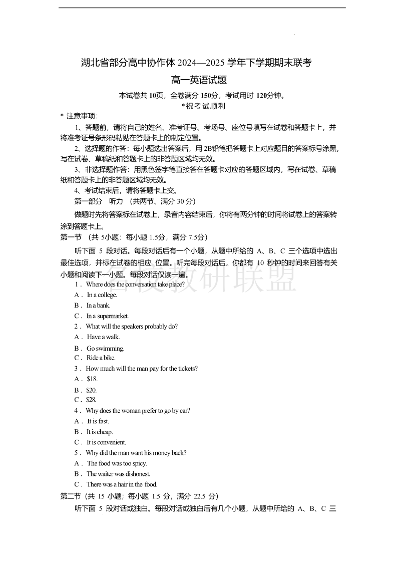湖北省部分高中协作体2024-2025学年高一下学期期末联考 英语试卷(含答案).pdf